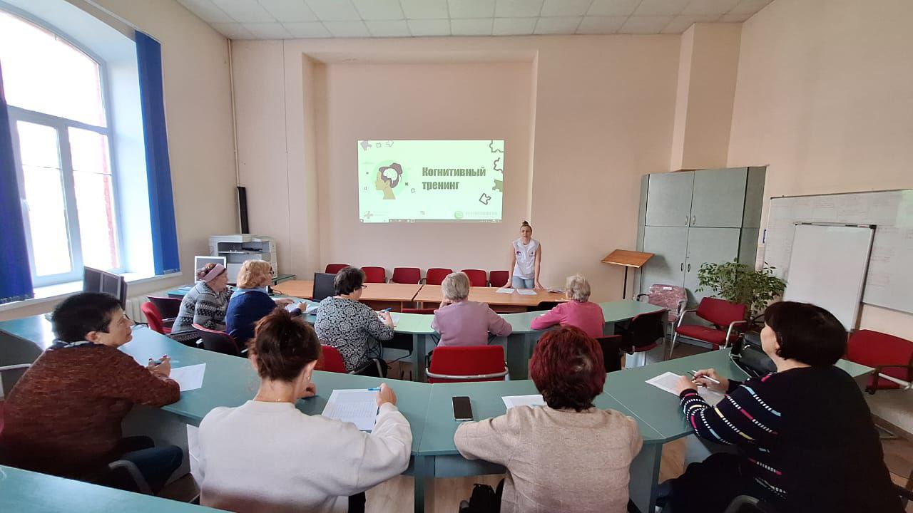 Затем пожилые люди потренировали ум с помощью когнитивного тренинга, а в завершение встречи волонтеры-медики провели для них когнитивную гимнастику.