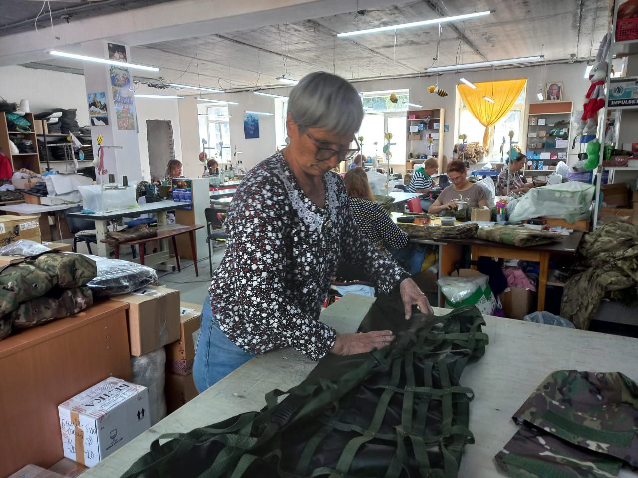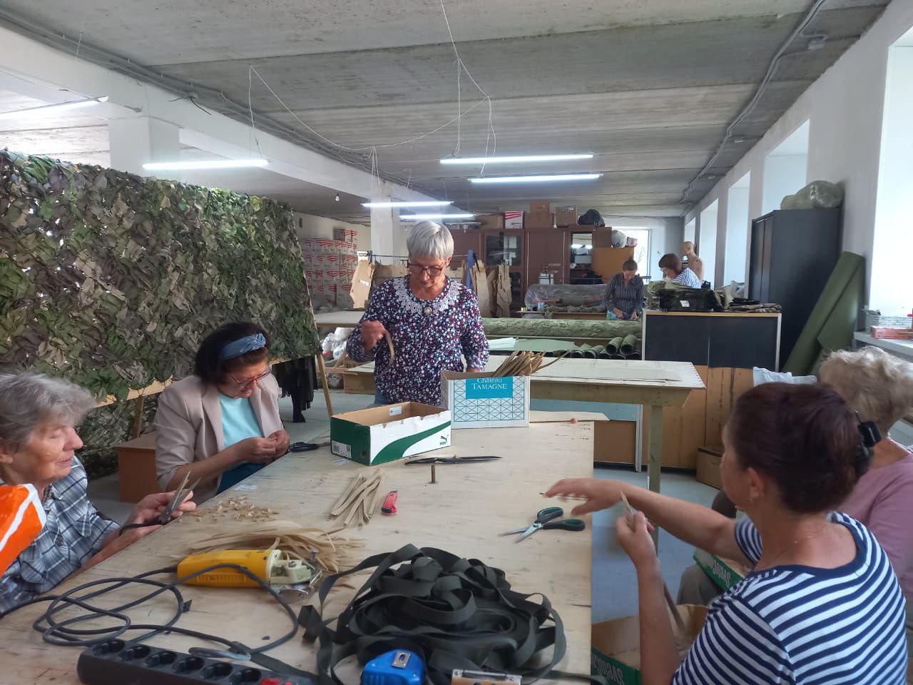 Активисты «золотого возраста» отрезали ткань, помогали упаковывать вещи для отправки, а еще особым образом срезали уголки с лент, которые затем пойдут на изготовление маскировочных сетей и костюмов.