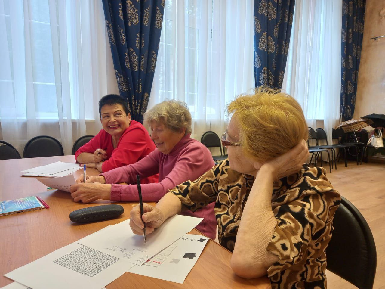 Пожилые люди с удовольствием решали головоломки и тесты, а завершение занятия поблагодарили волонтеров за разминку для ума.