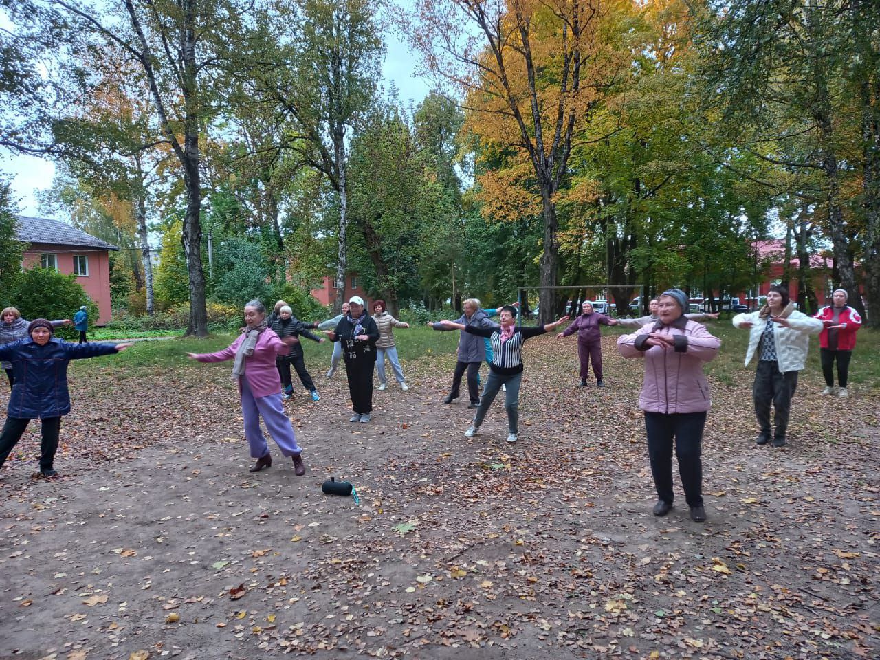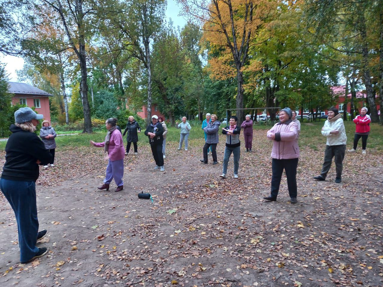 6 октября пожилые люди занимались не только северной ходьбой, но и пришли на занятие по нейрогимнастике, которое тоже проводилось на свежем воздухе под руководством Елены Михайловны.