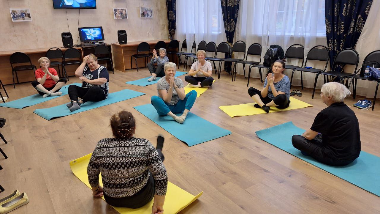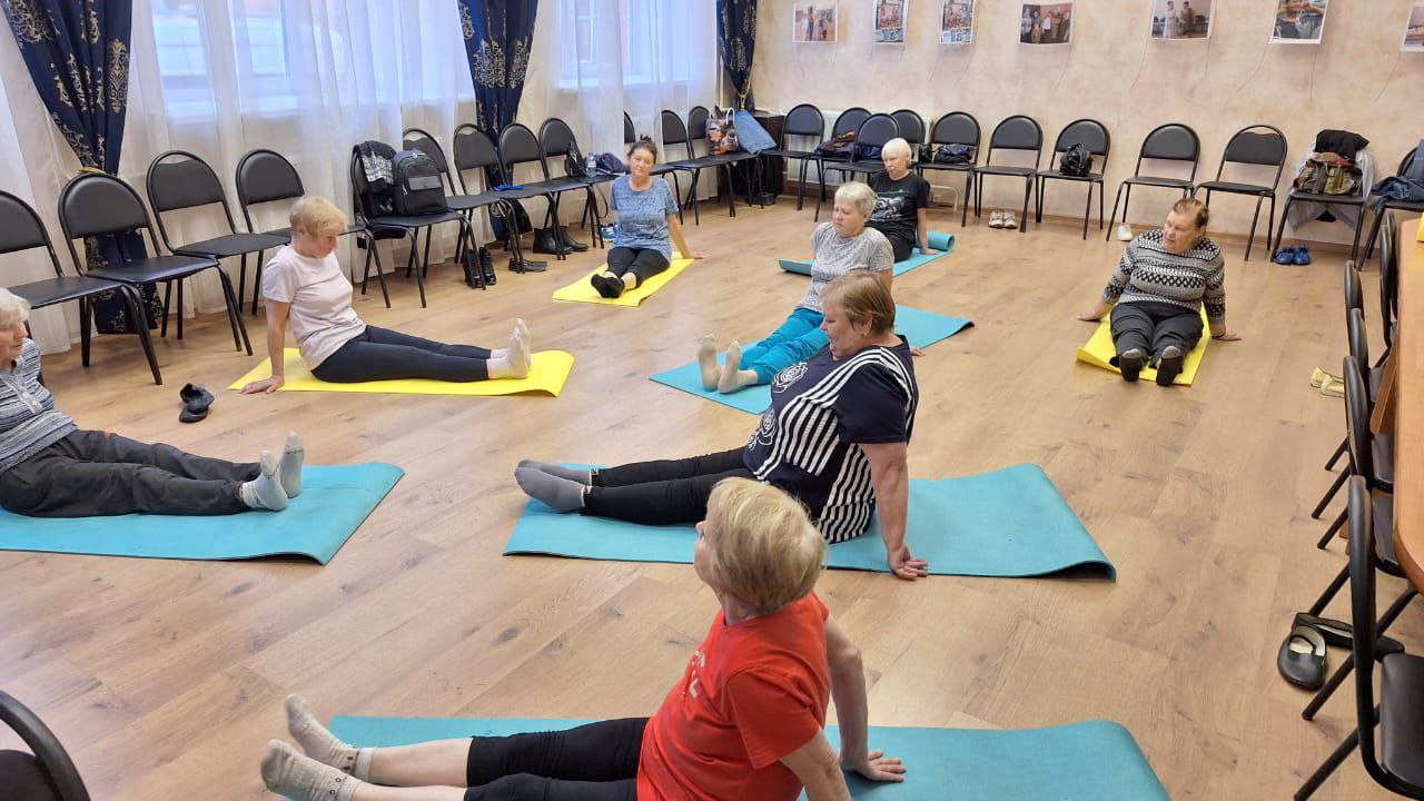 Первая часть была посвящена гимнастике, которую пожилые люди выполняли на ковриках, разминая суставы и подтягивая мышцы.